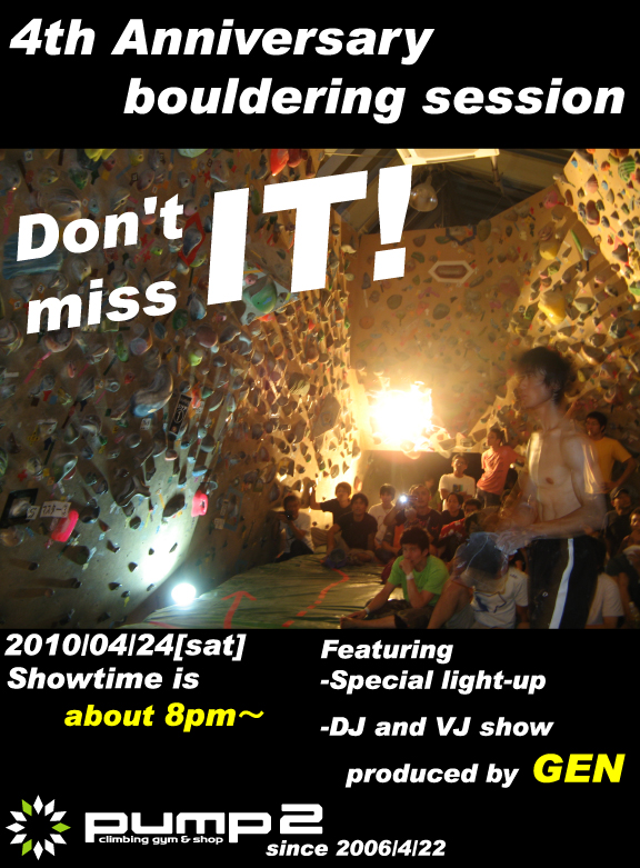 で、4周年を記念してPUMP2では今度の土曜日24日に4周年記念イベントを開催しますが、ボルダリングのイベントがない