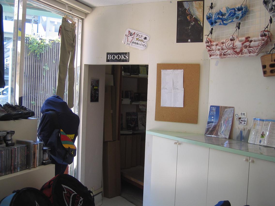 の書籍コーナーなのです。P2ではクライミングに関する技術本はもちろん、100岩場、黒本など国内のトポ(ガイドブック)、UtahやYosemiteなどの海外岩場のトポ、そして国内外のクライミングマガジンをバックナンバーを含めて販売してます。